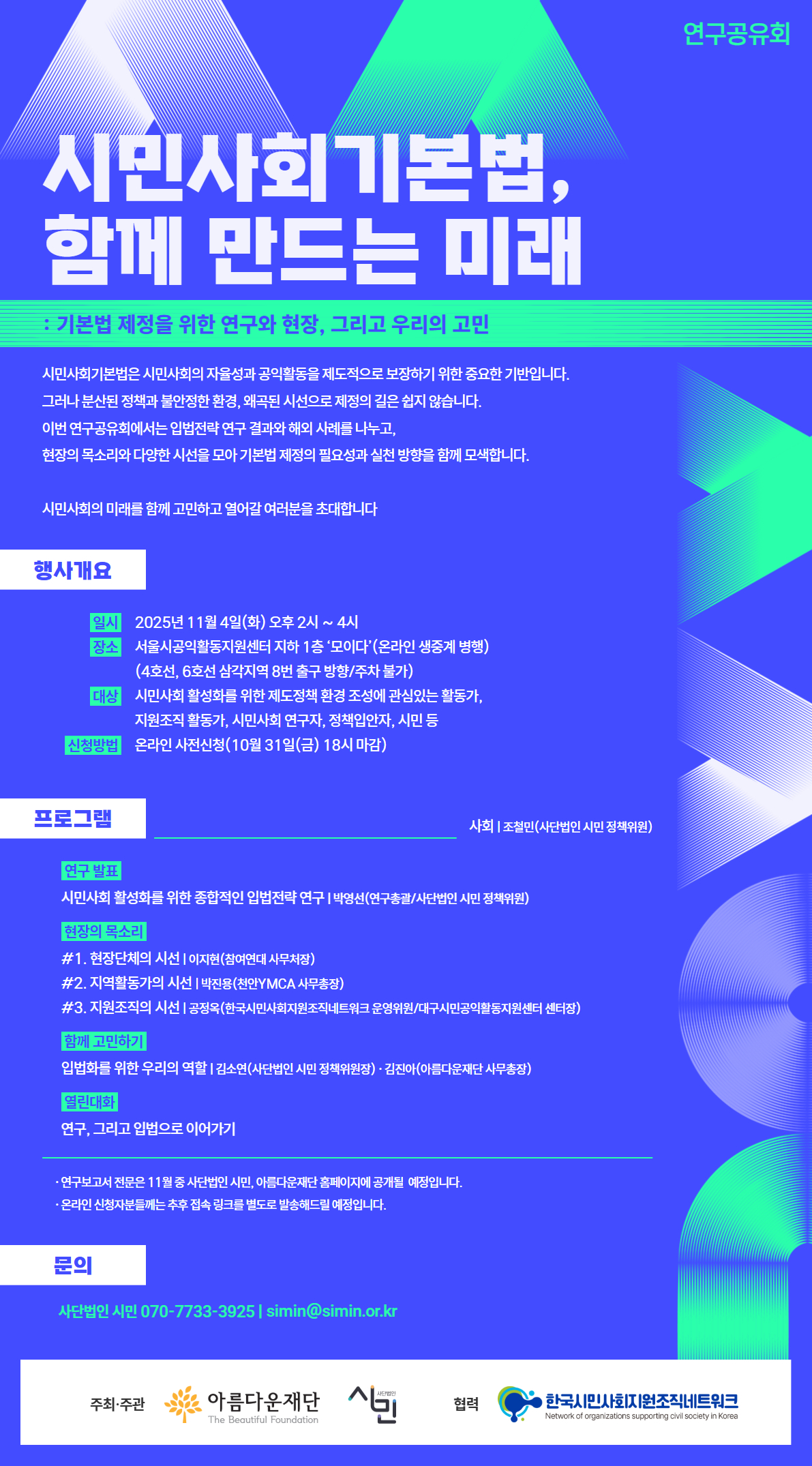 시민사회기본법은 시민사회의 자율성과 공익활동을 제도적으로 보장하기 위한 중요한 기반입니다. 그러나 분산된 정책과 불안정한 환경, 왜곡된 시선으로 제정의 길은 쉽지 않습니다. 이번 연구공유회에서는 입법전략 연구 결과와 해외 사례를 나누고, 현장의 목소리와 다양한 시선을 모아 기본법 제정의 필요성과 실천 방향을 함께 모색합니다.